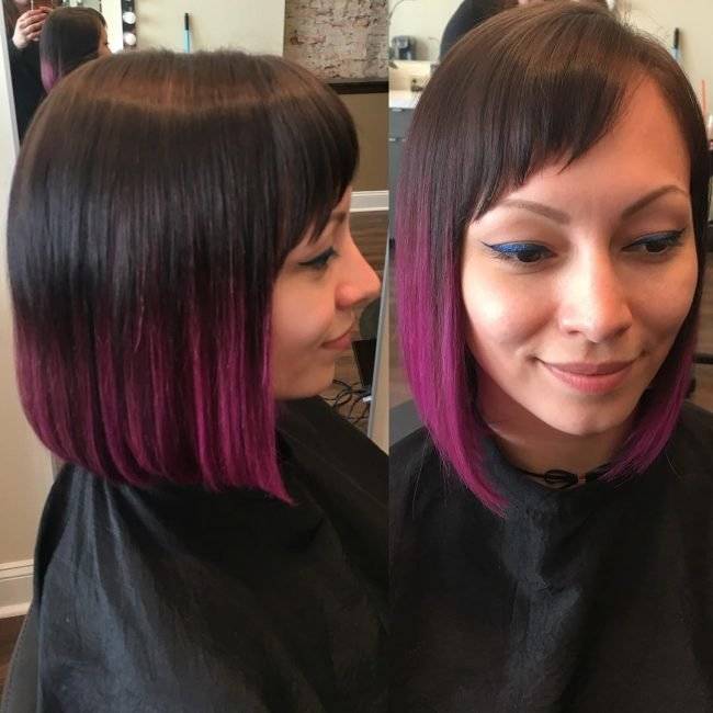 - Квадратное. Лицо смотрится несимметрично, а сделать образ гармоничнее можно с помощью градуированной, рваной челочки. Здесь могут присутствовать неровности. В этом случае прекрасно подходит колорирование, необходимо лишь правильно подобрать цвета.
