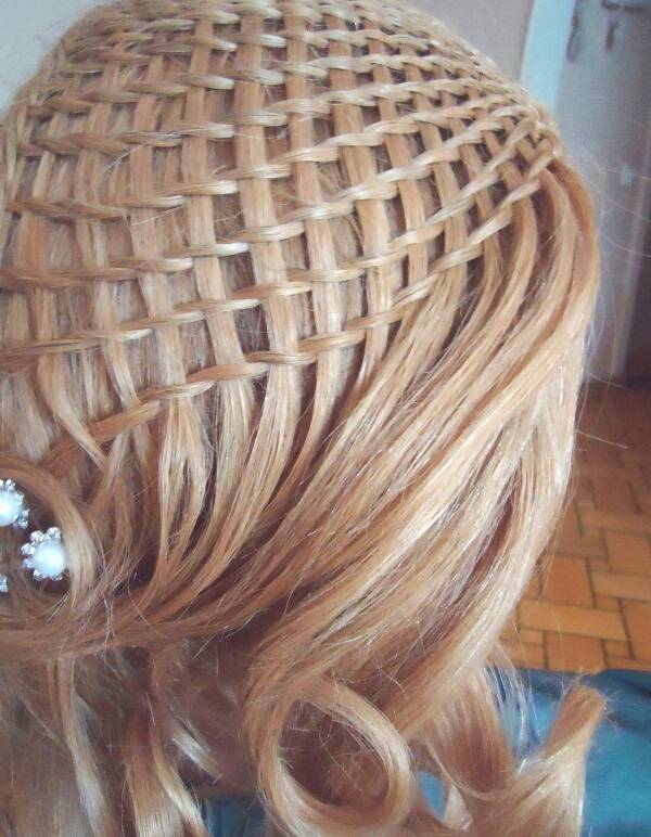 Замысловато выглядят волосы окутанные сеточкой. Для ее создания можно использовать много маленьких резиночек или особую технику плетения. Ячейка сетки и узор могут варьировать в зависимости от натяжения и количества прядей. Стильно смотрится оформление, сделанное у виска с одной стороны.