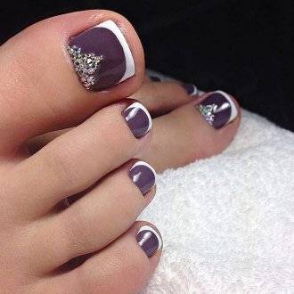 Белым цветом красится только краешек ногтевой пластины. Само основание покрывается лаком бежевого, светло-розового или бледно-персикового оттенка. Такой маникюр на пальчиках ног можно дополнить блестками, кристаллами или кружевом.