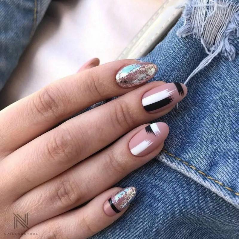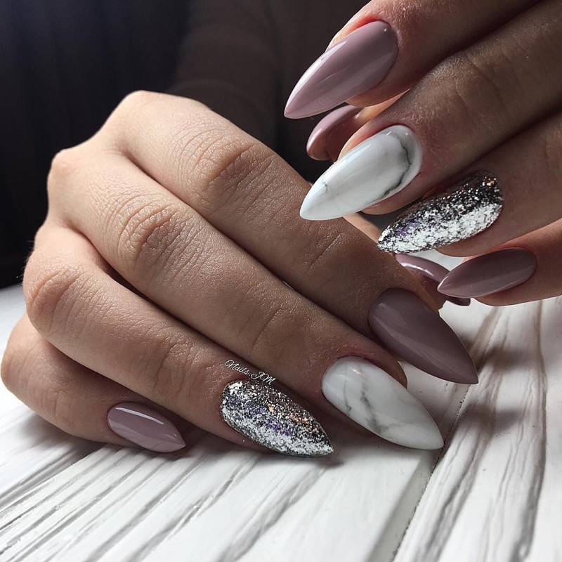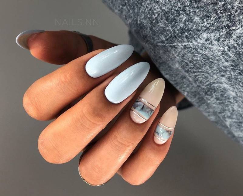 Пространство миндальных ноготков позволяет расположить на них интересный и содержательный декор. Именно на миндальных ногтях наиболее эффектно смотрится мраморный дизайн, маникюр с фольгированными полосками, дизайн с морской волной или дымкой.