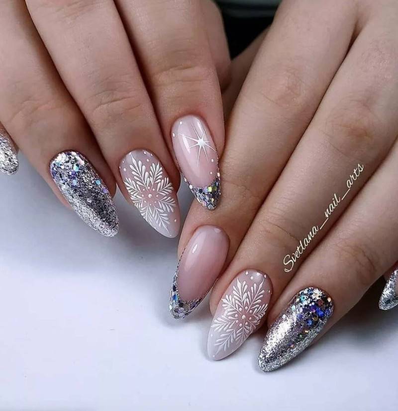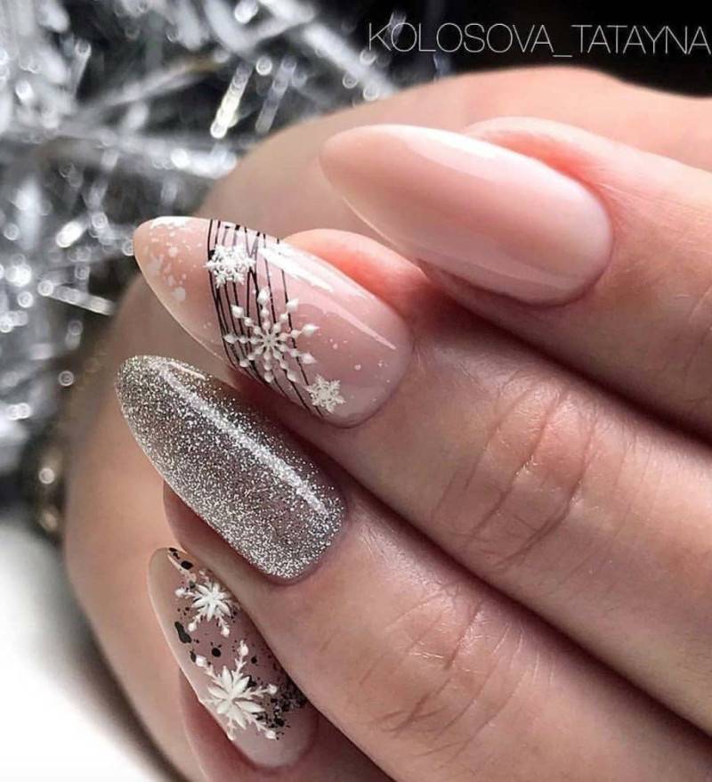 Отлично будет смотреться маникюр, сделанный в зимних тонах, омбре, градиентный. Очень красиво выглядит серебристый кракелюр. Такой маникюр напоминает узор на стекле в морозную погоду. Не следует делать ноготки черного, грязно-зеленого или синего цвета.