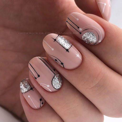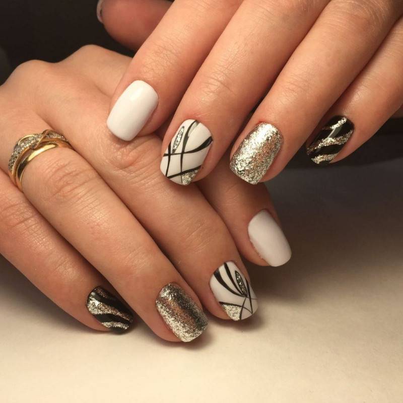Очень эффектно смотрятся узоры с золотым или серебряным переливом. Самый простой способ сделать рисунки на ногтях – нанести прозрачный лак в определенных местах, формируя изображения. Затем присыпать поверхность блестками.