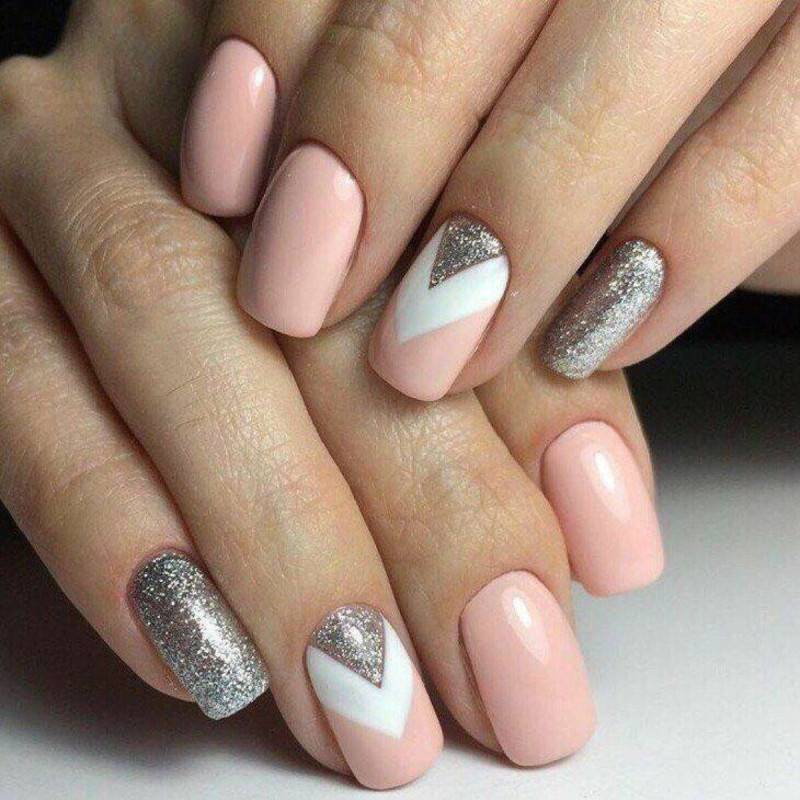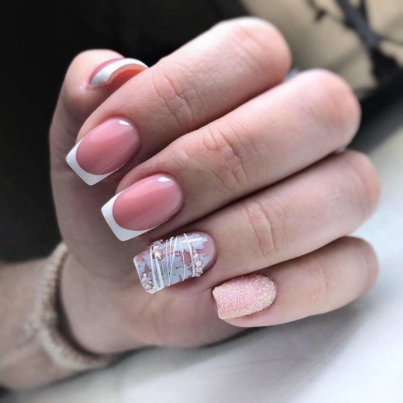– френч с блесками на кончиках. Именно этот вариант маникюра имеет наибольшую популярность среди перечисленных. А сделать его просто! На розовую или бежевую основу нанесите прозрачным лаком линию улыбки. Опустите ноготь в баночку с блестками. Спустя некоторое время, смахните с пластинки лишние блестки. Покройте ноготь прозрачным финишем, чтобы выровнять покрытие и закрепить результат. Если вы используете блестящий лак, то нанесите на кончик несколько слоев, чтобы сделать декор более выразительным. Концентрация блесток на кончике ногтя должна быть высокая.