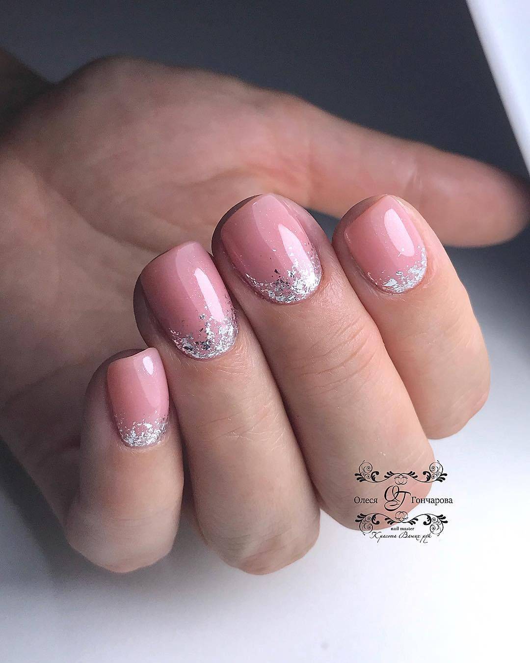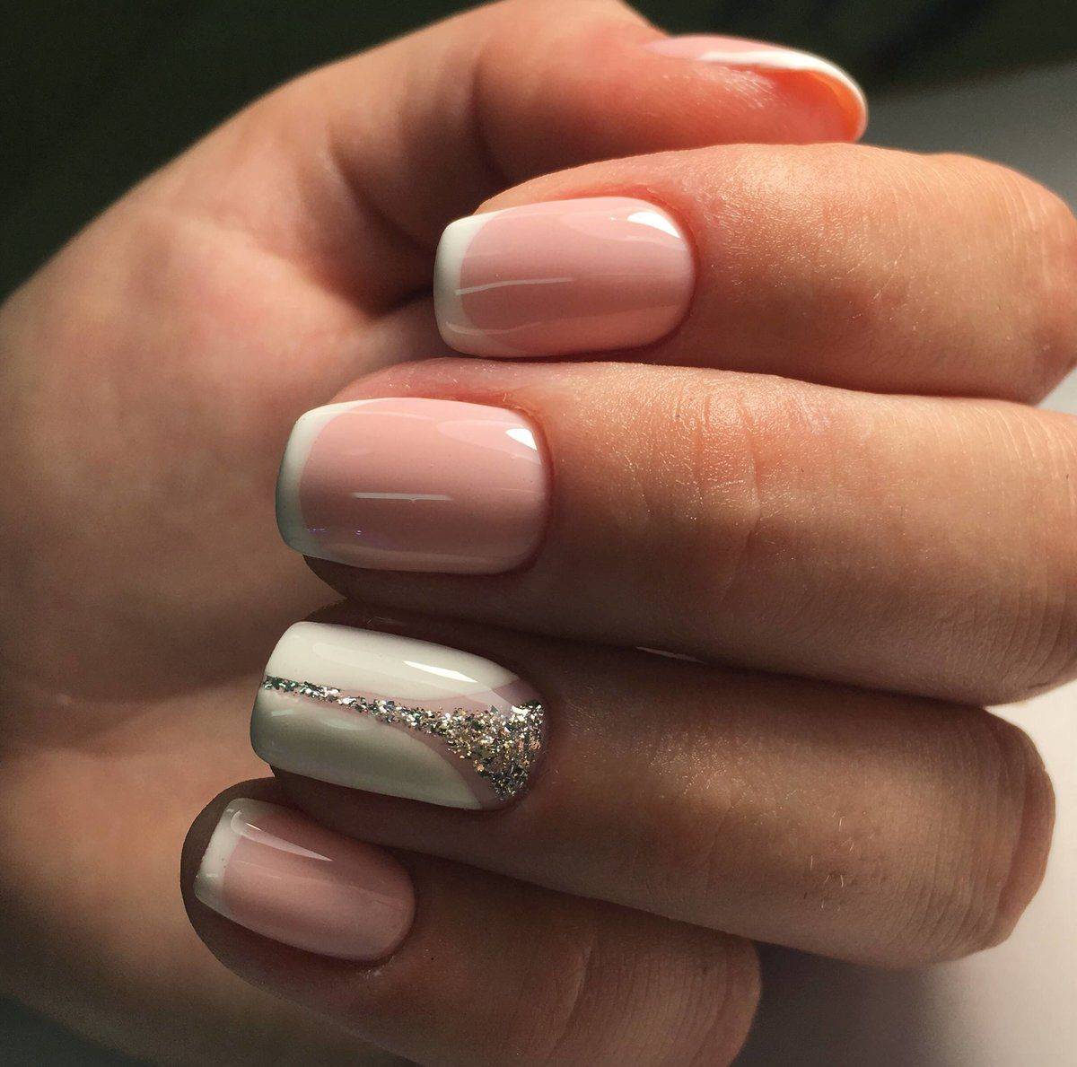 Чрезвычайно хорошо смотрится френч с блестками на коротких ногтях, если придерживаться правильных пропорций при создании основы и линии улыбки. Выделенный кончик не должен быть слишком широким.