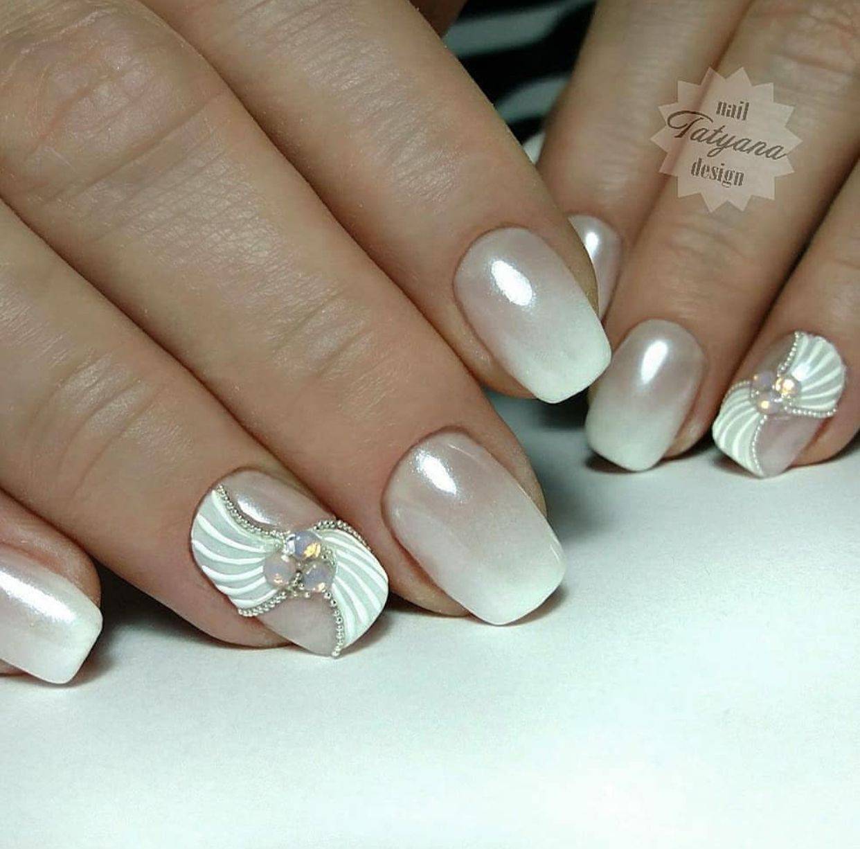 Нежный маникюр с использованием декоративного элемента очень красиво смотрится на любой длине и форме.
