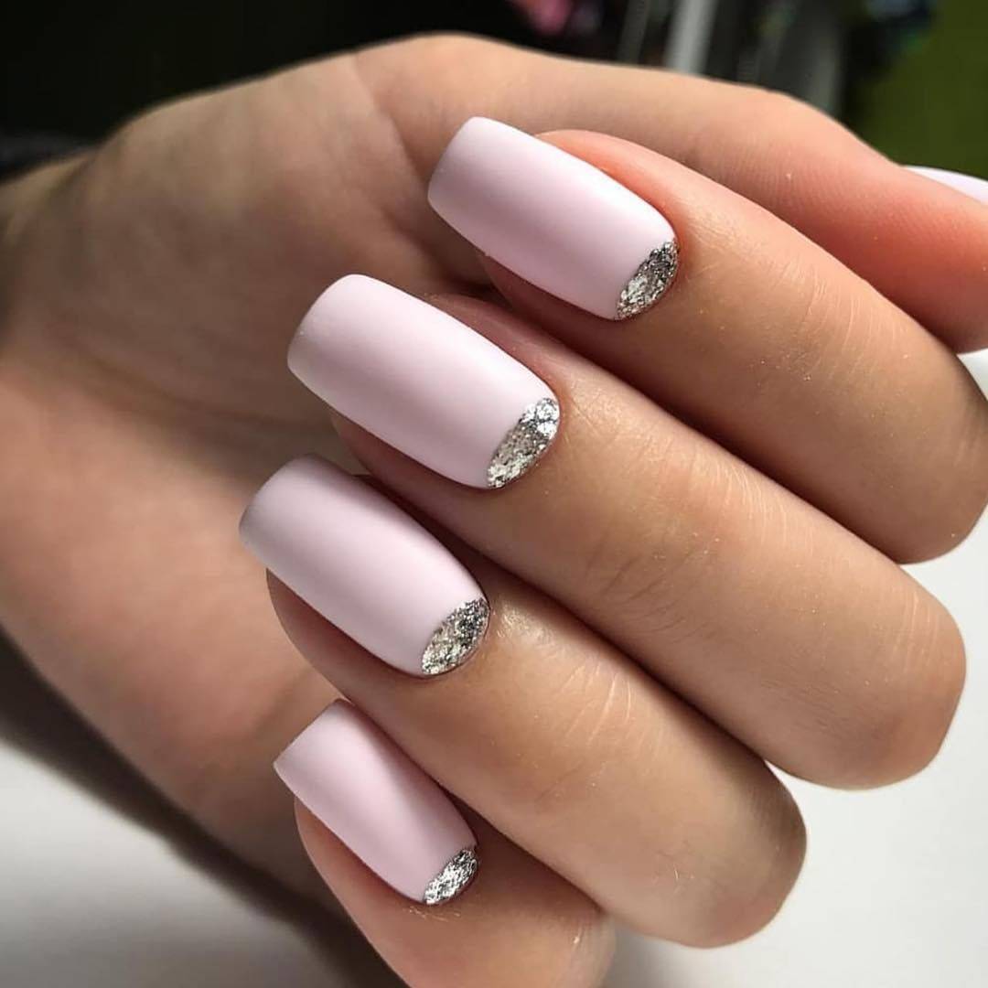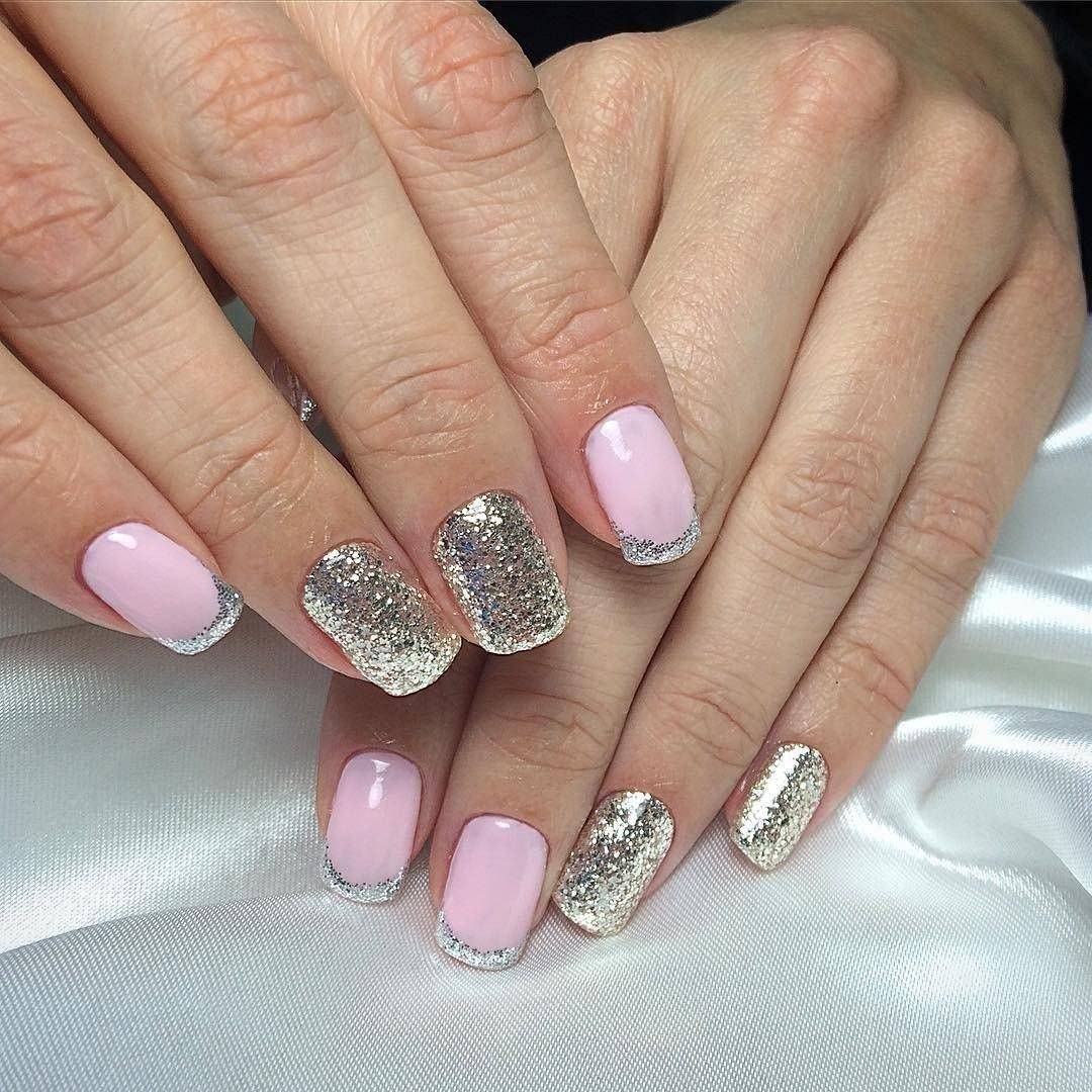 – френч с блесками на кончиках. Именно этот вариант маникюра имеет наибольшую популярность среди перечисленных. А сделать его просто! На розовую или бежевую основу нанесите прозрачным лаком линию улыбки. Опустите ноготь в баночку с блестками. Спустя некоторое время, смахните с пластинки лишние блестки. Покройте ноготь прозрачным финишем, чтобы выровнять покрытие и закрепить результат. Если вы используете блестящий лак, то нанесите на кончик несколько слоев, чтобы сделать декор более выразительным. Концентрация блесток на кончике ногтя должна быть высокая.