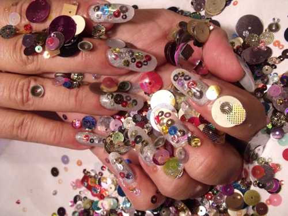 Тут придется воспользоваться зубочисткой, шпилькой, дотсом. Крупные блестки (глиттер) выкладываются по одной на невысохший лак в выбранном порядке.
