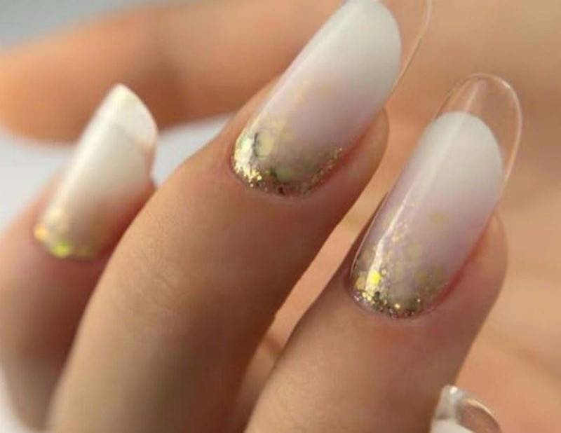 Декорирование ногтей может быть произведено с помощью глиттерных лаков, содержащих крупные блестки. Такой вариант отлично подходит для тех, кто решил сделать свадебный маникюр своими руками. Так называемое глиттер-омбре слегка напоминает французский маникюр и предполагает нанесение блесток на часть ногтя. Этот вариант декора придает маникюру нотку волшебства и прекрасно дополняет праздничный образ.