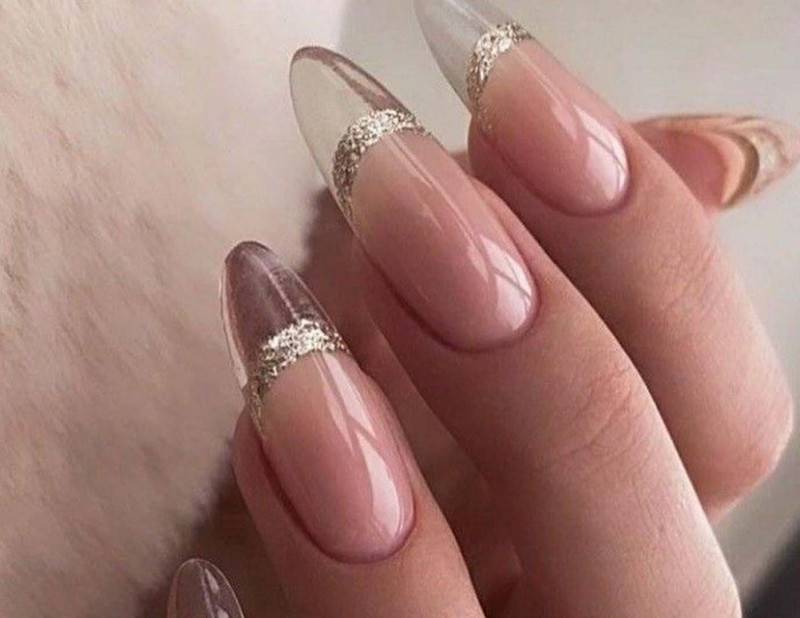 2. После того как прозрачная основа высохла, украшаем свободно отросший край ногтя блестками.