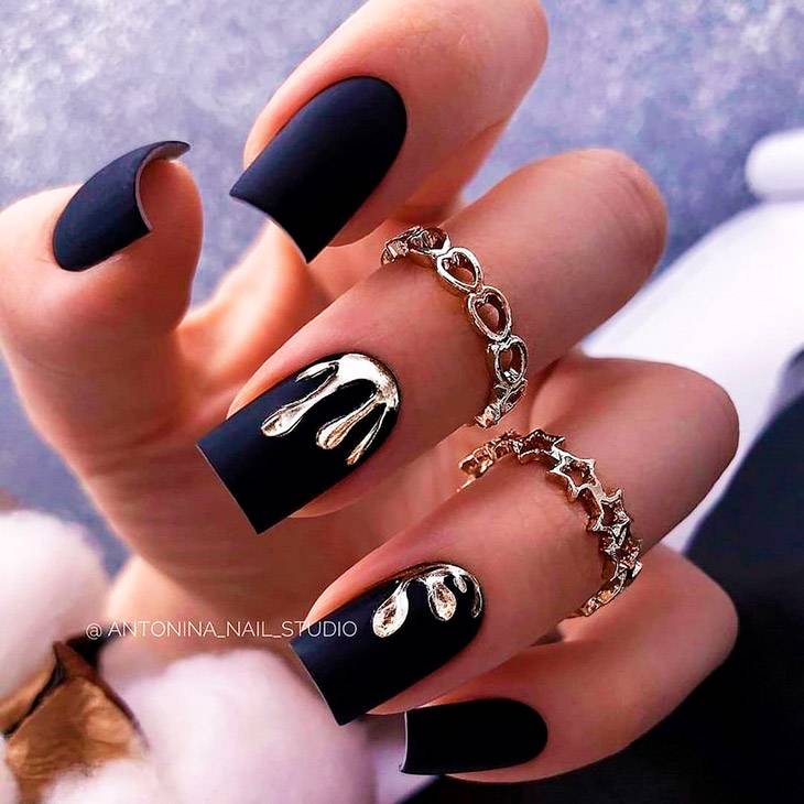 Сдержанный чёрный несомненно выглядит невероятно стильно. Сочетают как с прозрачной основой, так и исполнять в тоне френч. Дополнять узорами из серебряных, либо золотистых линии или глиттеров.