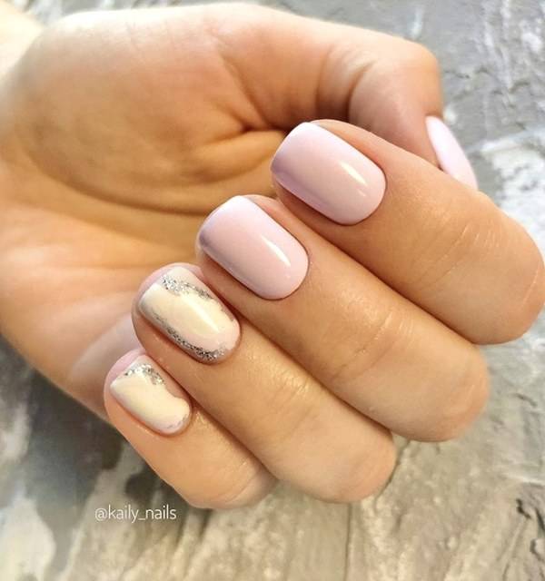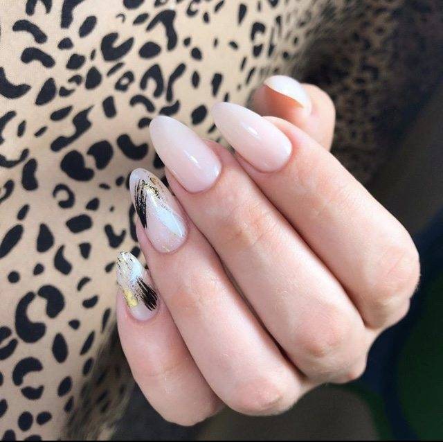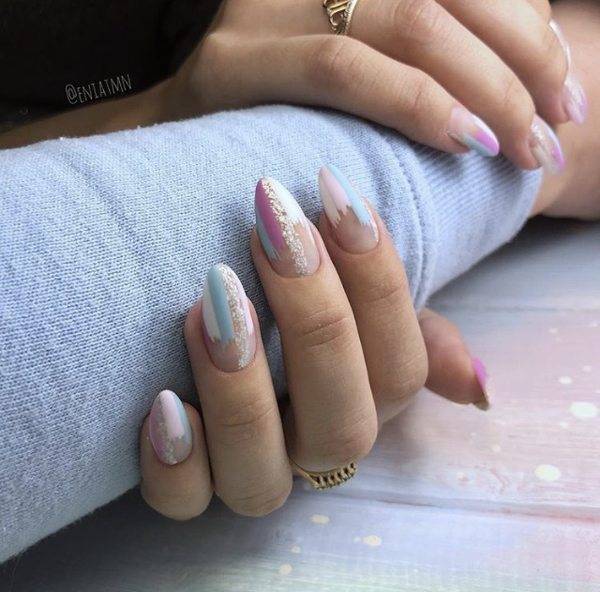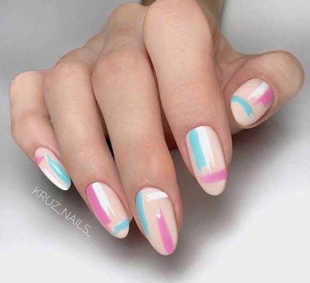 Очень нежно смотрятся мазки в сочетании с нюдовым маникюром или с негативным пространством. Если мазки сделать более яркими, то можно смело отправляться на вечеринку. А если сделать их в пастельной гамме, то можно абсолютно спокойно идти в офис или на свидание.