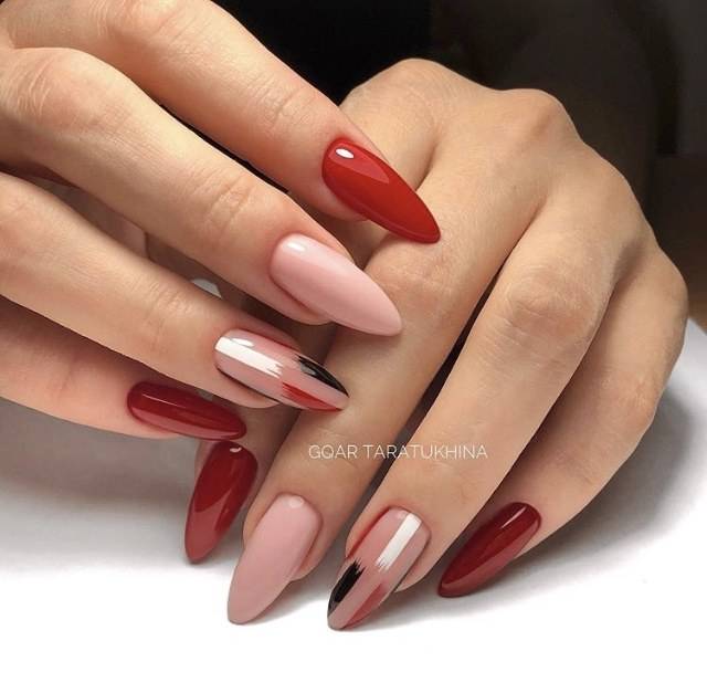 Красный всегда был признаком страсти, гармоничен с однотонным и на острой форме. Добавляют элегантную изюминку ажурные узоры, либо черная паутинка.