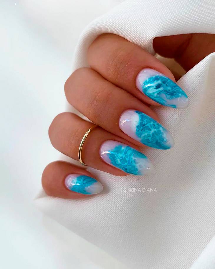 Голубой относится к пастельной гамме, изумительно смотрится в технике градиента и разводов. Дополняют цветочками, либо блестящей втиркой.