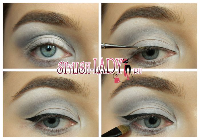 В следующей технике макияжа главным акцентом является стрелка и затемненная область сверху. При этом все веко, область под бровью и внутренний уголок глаза необходимо высветлить. В палетке теней для данного макияжа должны быть представлены различные оттенки серого цвета – как темные, так и светлые. Для начала средним светлым оттенком нужно покрыть полностью подвижное и нижнее веко, не затрагивая уголок глаза при этом.