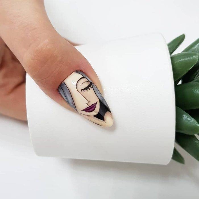 Мастер должен быть художником, чтобы выполнить такой рисунок. Некоторые делают его на короткой ногтевой пластине. Есть образцы, когда портрет выполняется тонкой линией без отрыва. Для этого надо долго тренироваться, иметь художественный вкус, определенный навык.