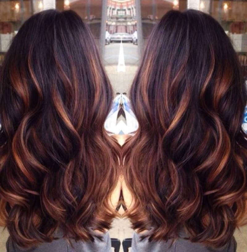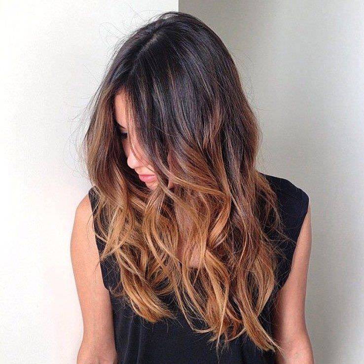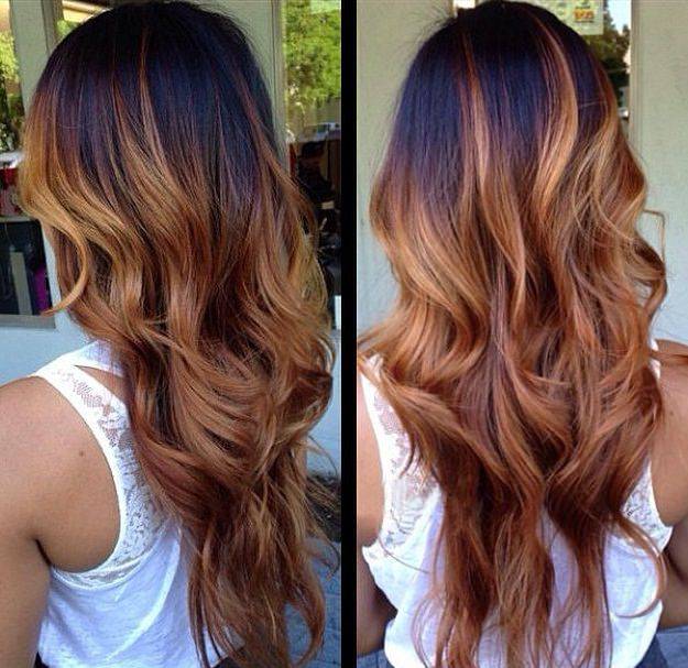 карамель, мед и коньяк. На черных локонах это омбре становится трендом нынешнего сезона. Обратите взор на то, как выгодно выглядит переход оттенков коньяка, кофе, золота, каштана, меда и карамели на темных локонах. Подобный выбор омбре на черных волосах особенно нравится красавицам Голливуда;