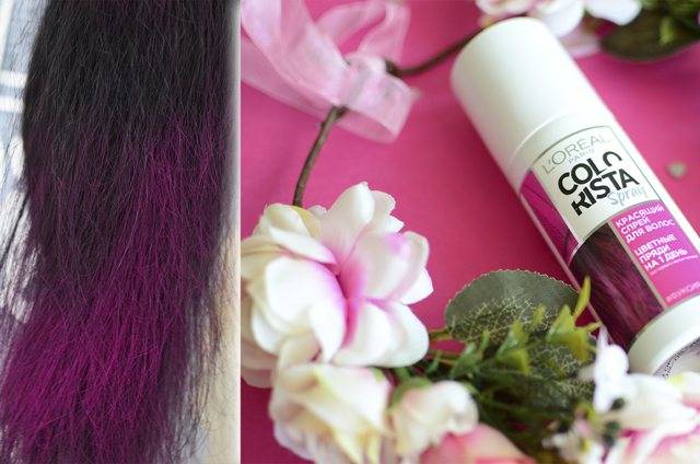 Сразу предупрежу, что если у вас темный цвет волос, то спрей наносить необходимо будет в несколько этапов, наслаивая интенсивность оттенка. В итоге я смогла добиться достаточно яркого цвета волос и решила ограничиться окрашиванием кончиков: