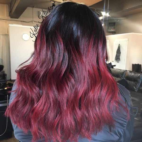 На фото красное омбре на черных волосах, еще один популярный тренд 2017 года. Такой вариант подойдет для смелых молодых и раскрепощённых девушек желающих выделится из толпы.