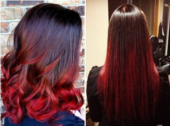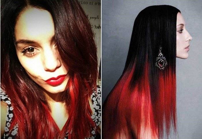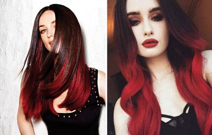 Такое окрашивание особенно хорошо смотрится на шатенках или брюнетках. Омбре «черный с красным» позволит создать образ роковой леди, при этом переход может быть как плавным (более женственный вариант), так и достаточно контрастным – его лучше делать при короткой стрижке с простыми линиями.