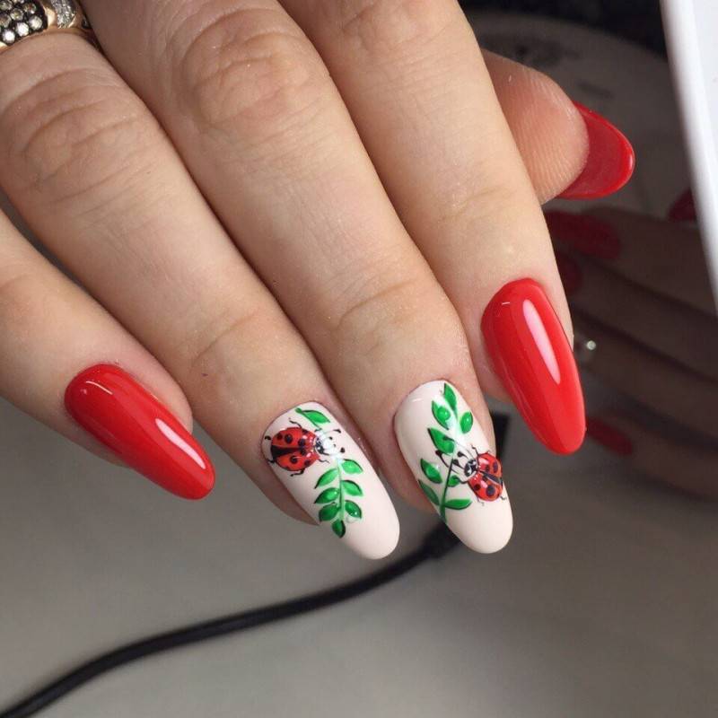 В 2020 году довольно актуальным является сочетание красного и зеленого цвета в маникюре. Но это вовсе не значит, что их должно быть только два. Зеленый чаще всего выступает в качестве акцента. То есть красно-белый маникюр может быть украшен цветочным принтом с крупными зелеными листьями. Выглядит данное оформление невероятно красиво и ярко.