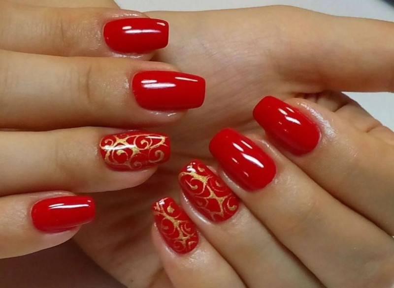 По-настоящему роскошным, праздничным будет маникюр, если сочетать красный цвет с золотистым или серебристым. Это может быть однотонное покрытие с россыпью блесток. В таком случае оформление получится не слишком ярким, но заметным. Для активного, броского эффекта можно добавить геометрические детали. Отлично смотрятся декоративные детали, такие как стразы, скотч-лента или оттиски фольги.
