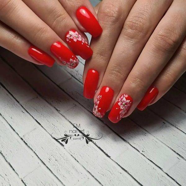 В 2020 году довольно актуальным является сочетание красного и зеленого цвета в маникюре. Но это вовсе не значит, что их должно быть только два. Зеленый чаще всего выступает в качестве акцента. То есть красно-белый маникюр может быть украшен цветочным принтом с крупными зелеными листьями. Выглядит данное оформление невероятно красиво и ярко.