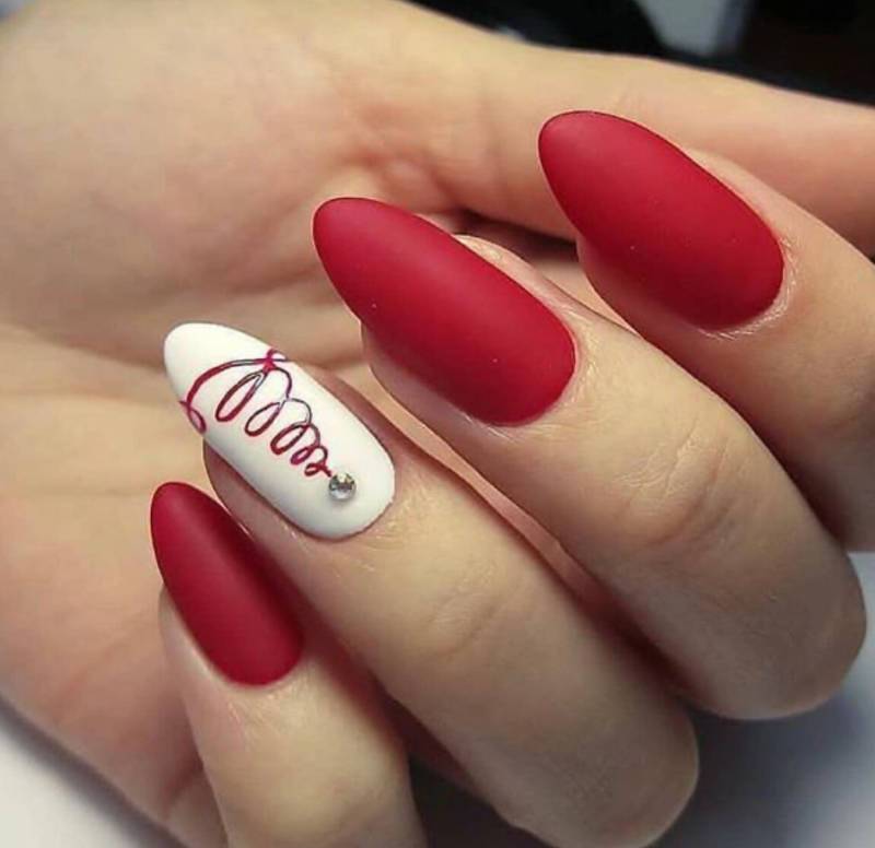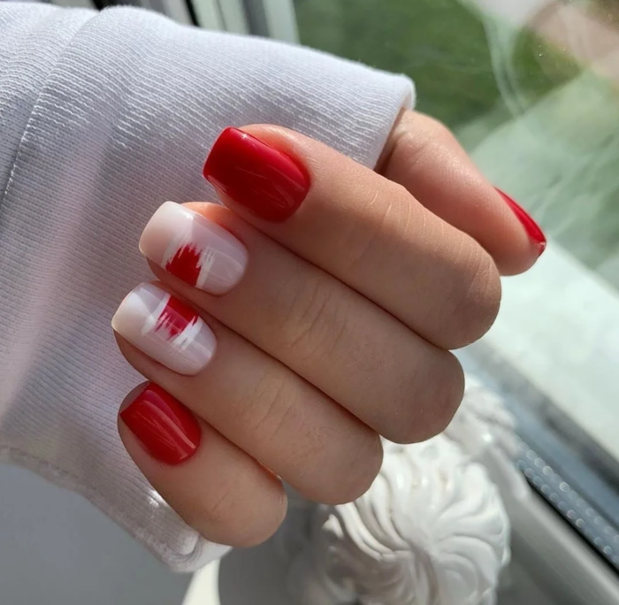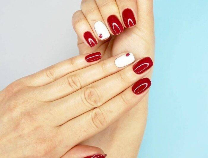 Красный маникюр в комбинации с белым смотрится очень красиво и модно. Этот тандем подходит практически всем, ведь красный цвет может быть разным: от цвета бургундского вина до ярко-красного.