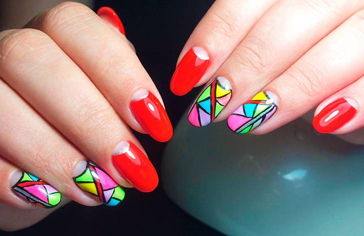 По расцветке дизайн красных ногтей может быть однотонным, выполненным в двух тонах или многоцветным, контрастным