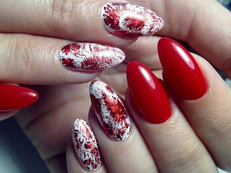 С помощью такой техники и красного лака можно создавать повседневные и праздничные дизайны для коротких ногтей. Красиво смотрится сочетание красного с изумрудным, серебряным и золотым оттенком. Фольгу можно наносить на все пальцы или на некоторые, в зависимости от выбранного дизайна. Такая техника подходит для глянцевого и матового покрытия. Ее можно сочетать с любыми другими декорами для создания трендового маникюра красного цвета на коротких ногтях.