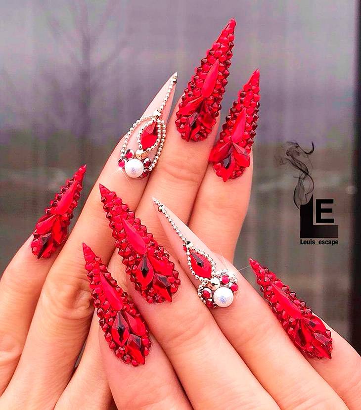 Для вечеринки подходит красный маникюр со стразами