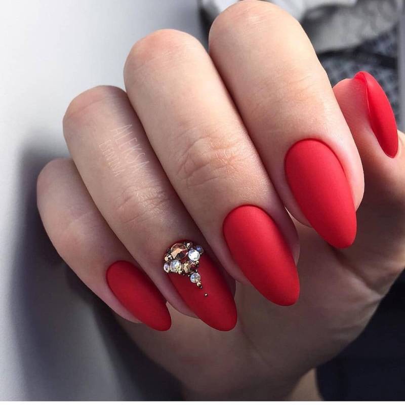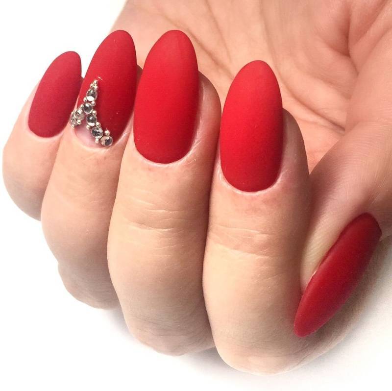 Матовый красный оттенок в маникюре выступает универсальным решением для девушек любого возраста. Он эффектно смотрится на коротких и длинных ногтях, поэтому подходит для повседневной носки и создания вечернего образа.