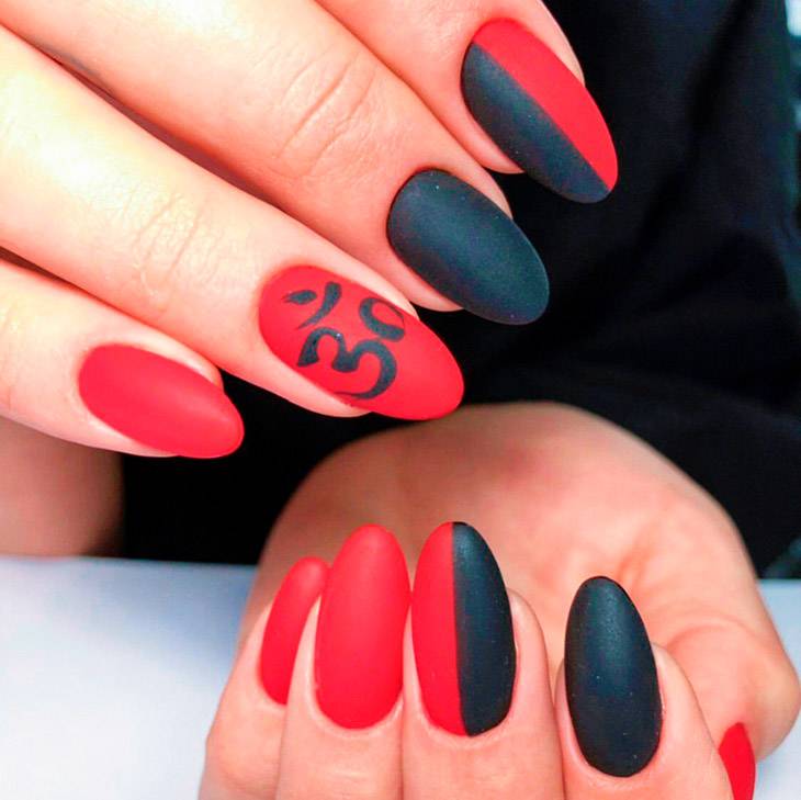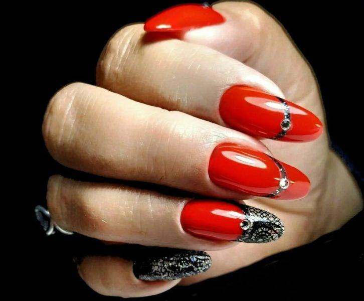 Красный лак в сочетании с черным цветом выглядит весьма необычно, а потому часто используется для создания на ногтях оригинального маникюра. При этом для каждого случая можно подобрать свой вариант дизайна, который будет смотреться по-разному.