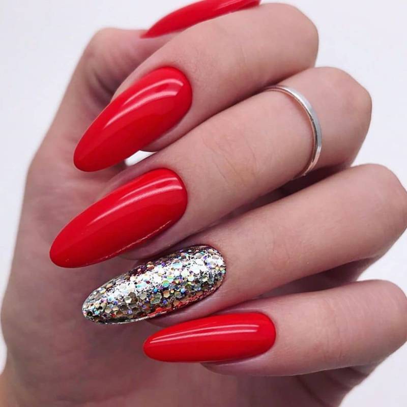 По-настоящему роскошным, праздничным будет маникюр, если сочетать красный цвет с золотистым или серебристым. Это может быть однотонное покрытие с россыпью блесток. В таком случае оформление получится не слишком ярким, но заметным. Для активного, броского эффекта можно добавить геометрические детали. Отлично смотрятся декоративные детали, такие как стразы, скотч-лента или оттиски фольги.