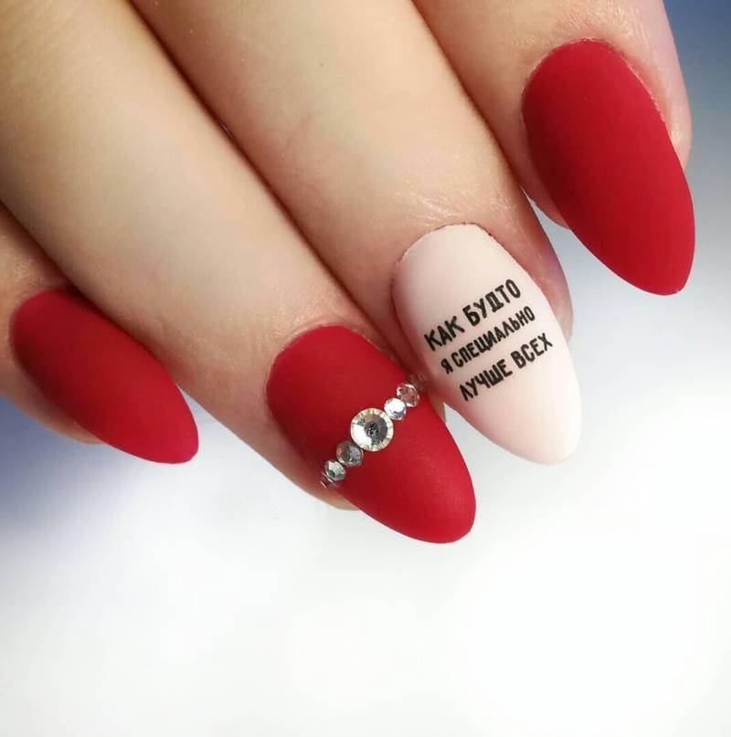 Красный маникюр с надписями является хорошей идеей для тех, кто любит необычные варианты дизайна ногтей. Наносить надпись на ногти можно не только в виде рисунка, но и при помощи лака с надписью.