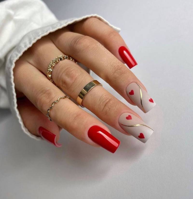 Красные лаки универсальны, они могут использоваться не только как самостоятельное покрытие, но и сочетаться с другими оттенками. Правильно подобранное сочетание цветов позволяет создавать уникальные дизайны для коротких ногтей. Отлично комбинируются друг с другом разные красные оттенки с глянцевой и матовой поверхностью, создавая изысканный маникюр за счет глубины бархатного покрытия.
