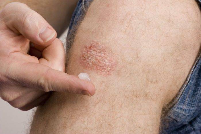 Хроническое неинфекционное заболевание кожи также нередко проявляется шелушащимися пятнами, которые могут появляться на любом участке тела. Существует немало разновидностей патологического процесса. Распространенным является бляшечный псориаз, при котором как раз таки и шелушится кожа. Если появились пятна на разгибательной поверхности (локти, внутренняя часть колен), скорее всего, пришлось столкнуться именно с этим заболеванием. Нередко сухость кожи наблюдается в области каймы волосистой части головы.