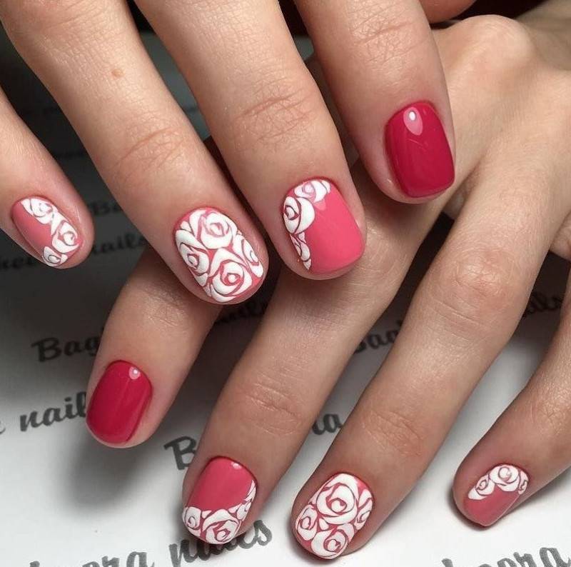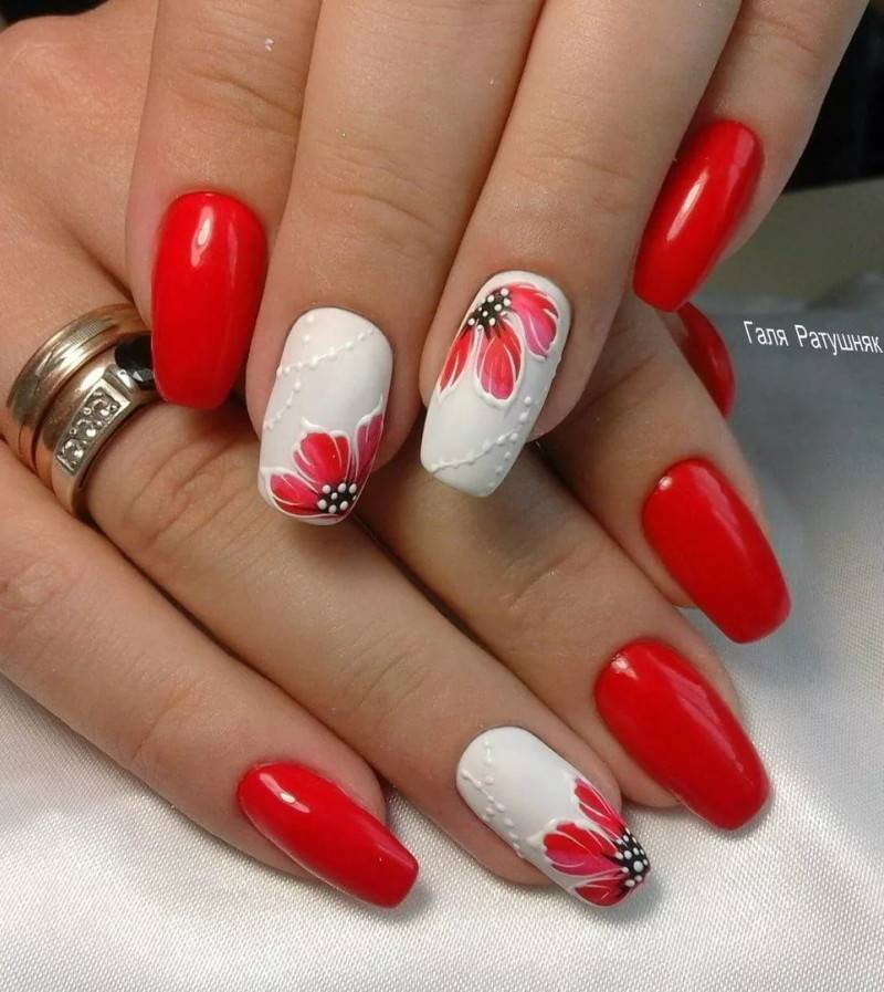 Белый цвет используется в качестве фона для нанесения флористики, геометрии, мраморного декора, абстракции. Визуально сочетание красного и белого смотрится объемно и насыщенно. Присмотритесь к французскому маникюру, где край ногтя выделен красным цветом, а остальное пространство ногтя окрашено белым цветом.