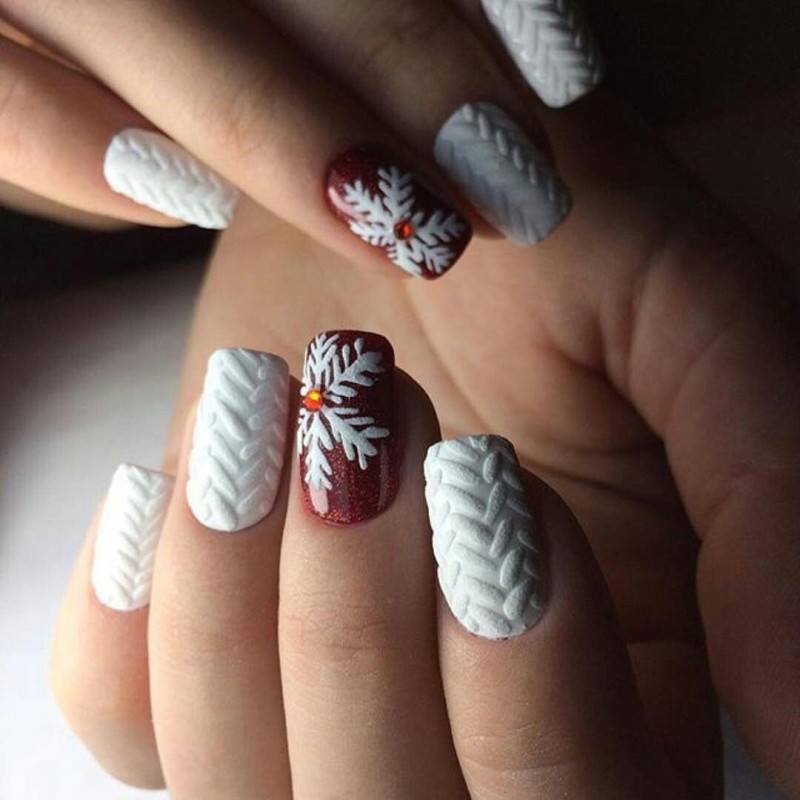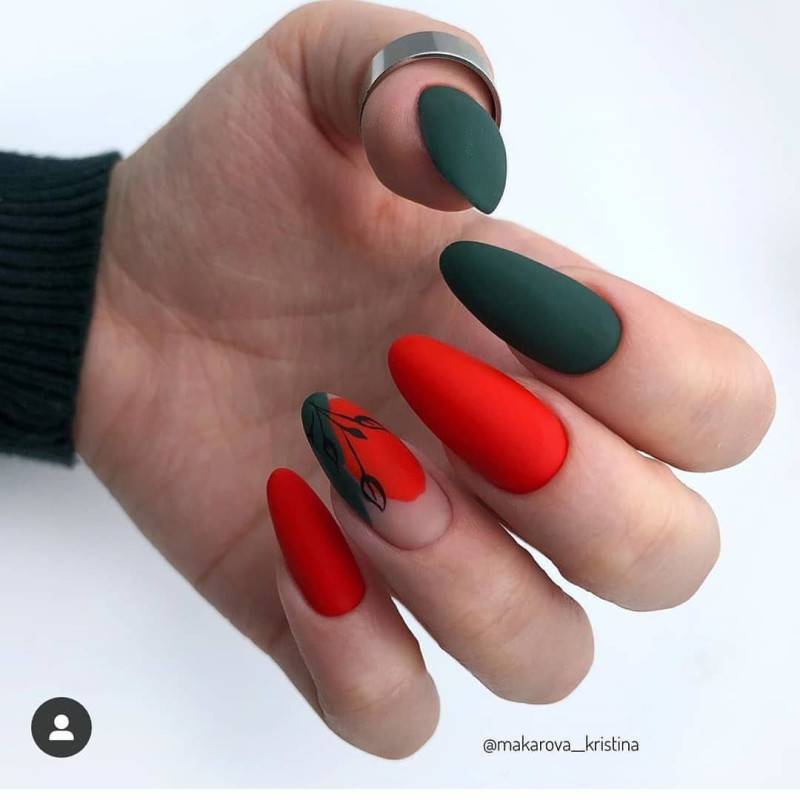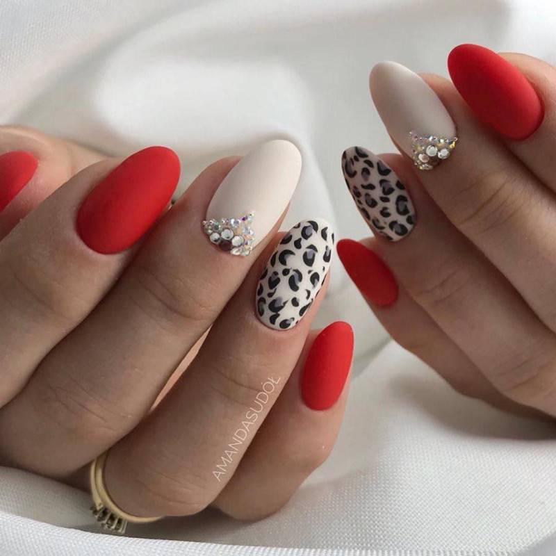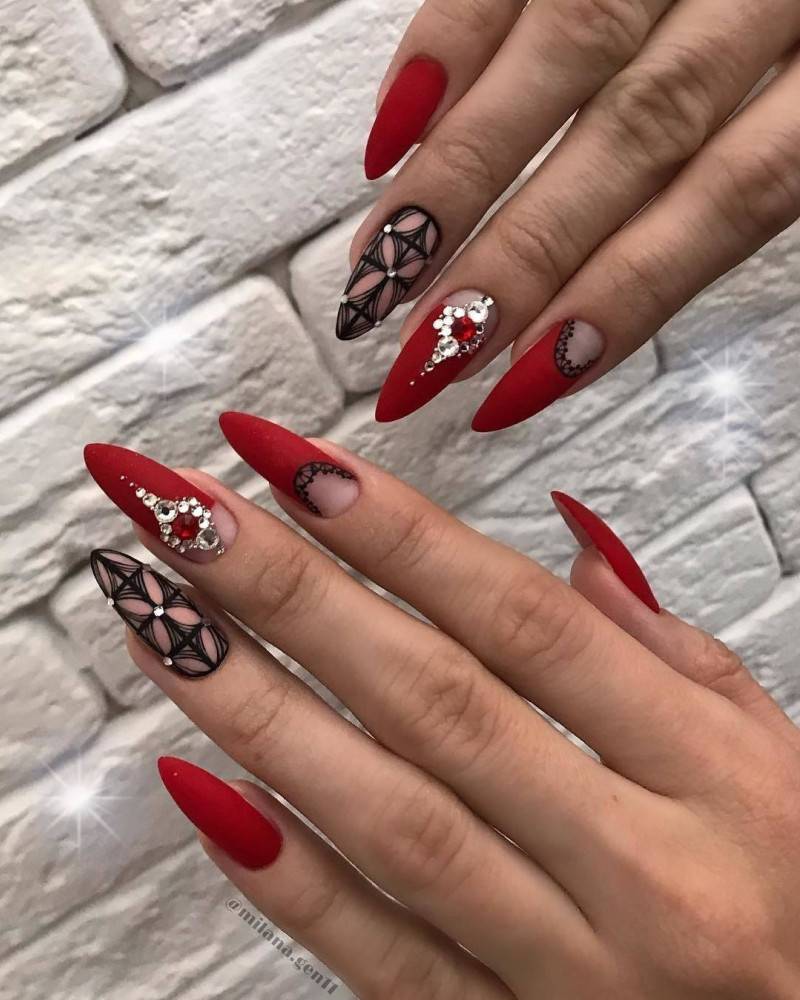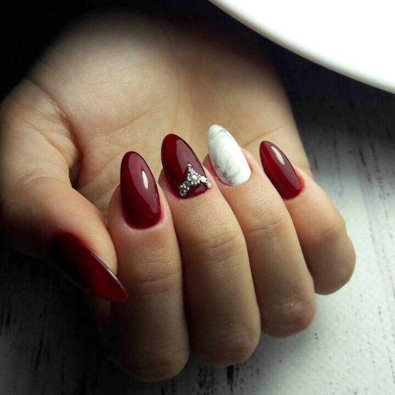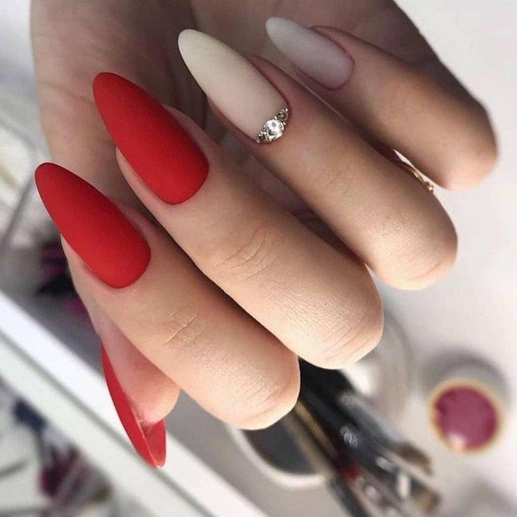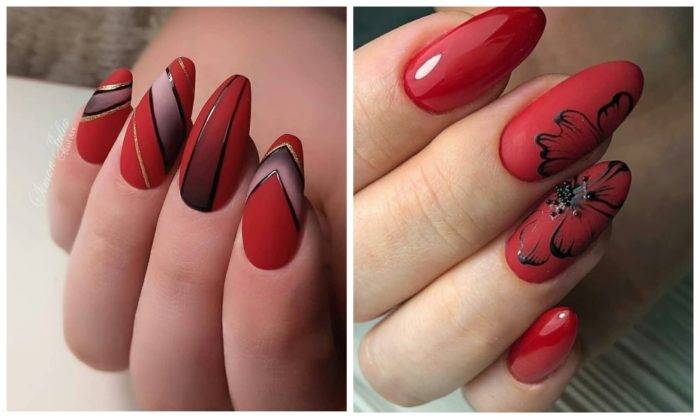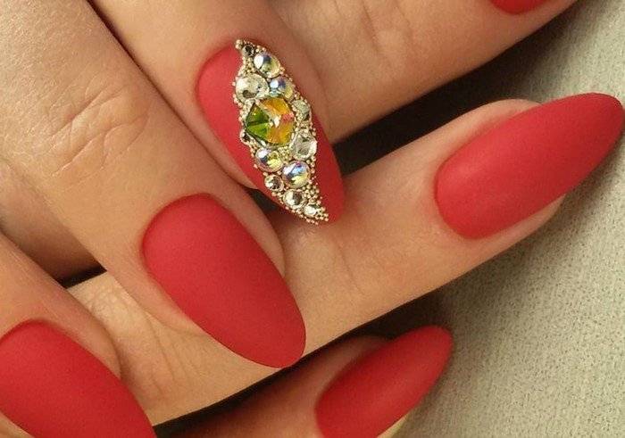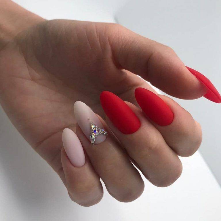 Наращенные или натуральные длинные ногти с классическим красным лаком – это самый эффектный, но все же скучный маникюр. Попробуйте матовый дизайн с блестящим декором, жемчугом. Чтобы не ошибиться, выбирайте темные оттенки красного — так маникюр не будет выглядеть аляповато.