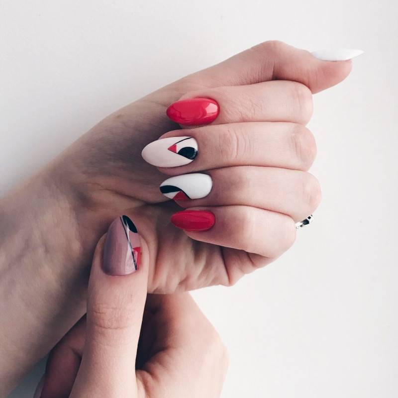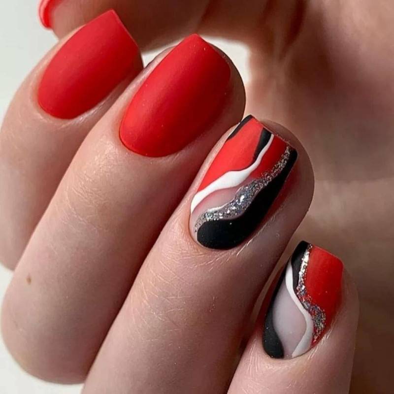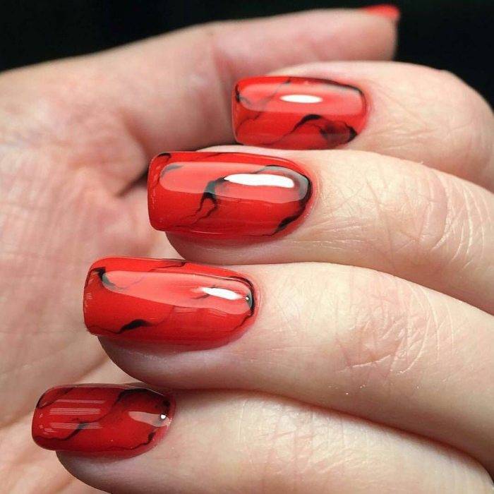 В моде черный с красным маникюр с принтами в виде мраморных или водных разводов. Абстрактный нейл-арт — тоже модный тренд. Новинка — маникюр «битое стекло». Чтобы создать эффект кракелюра, используют специальный лак. При его высыхании образуются трещинки, напоминающие битое стекло.