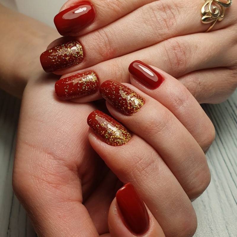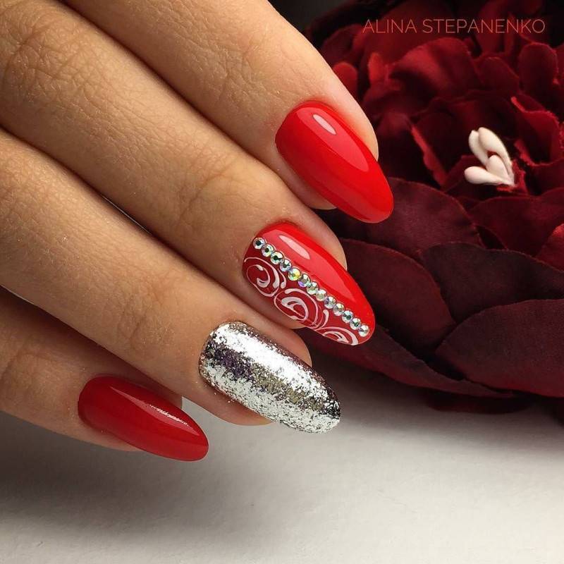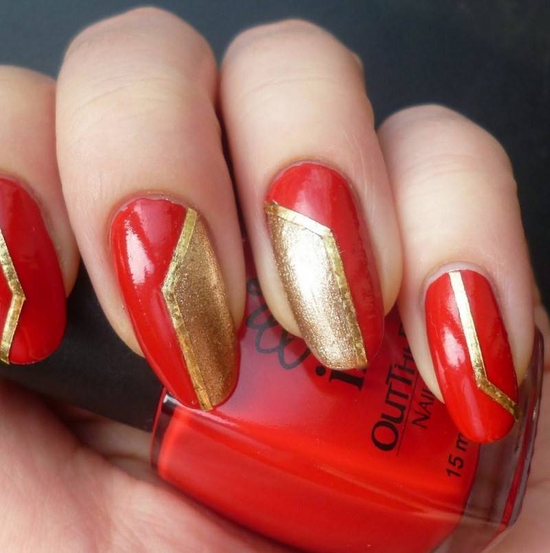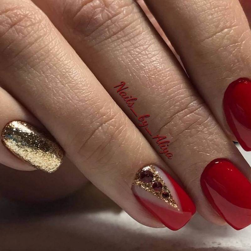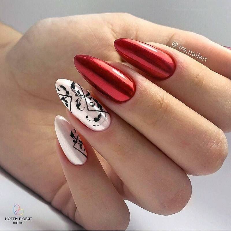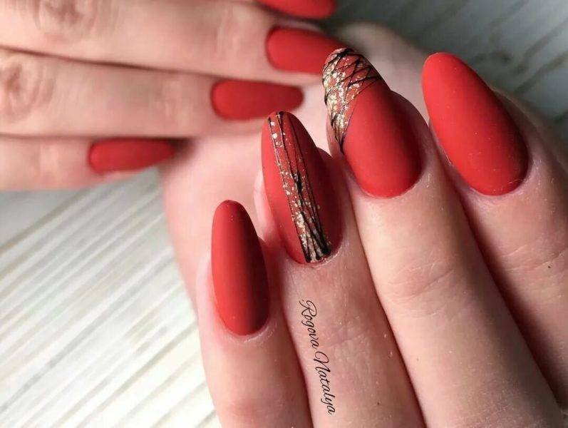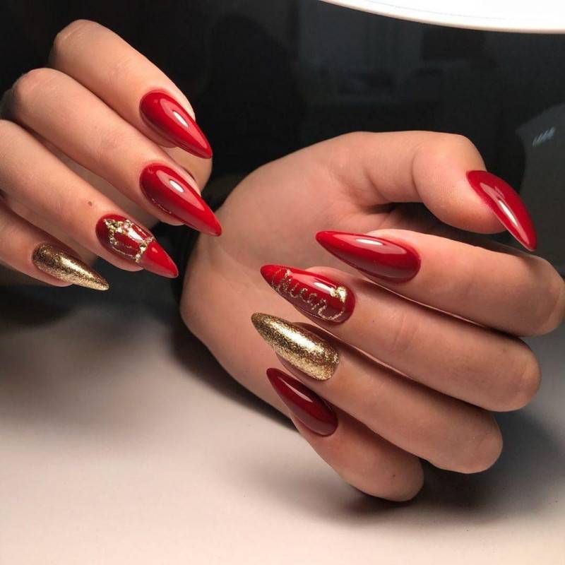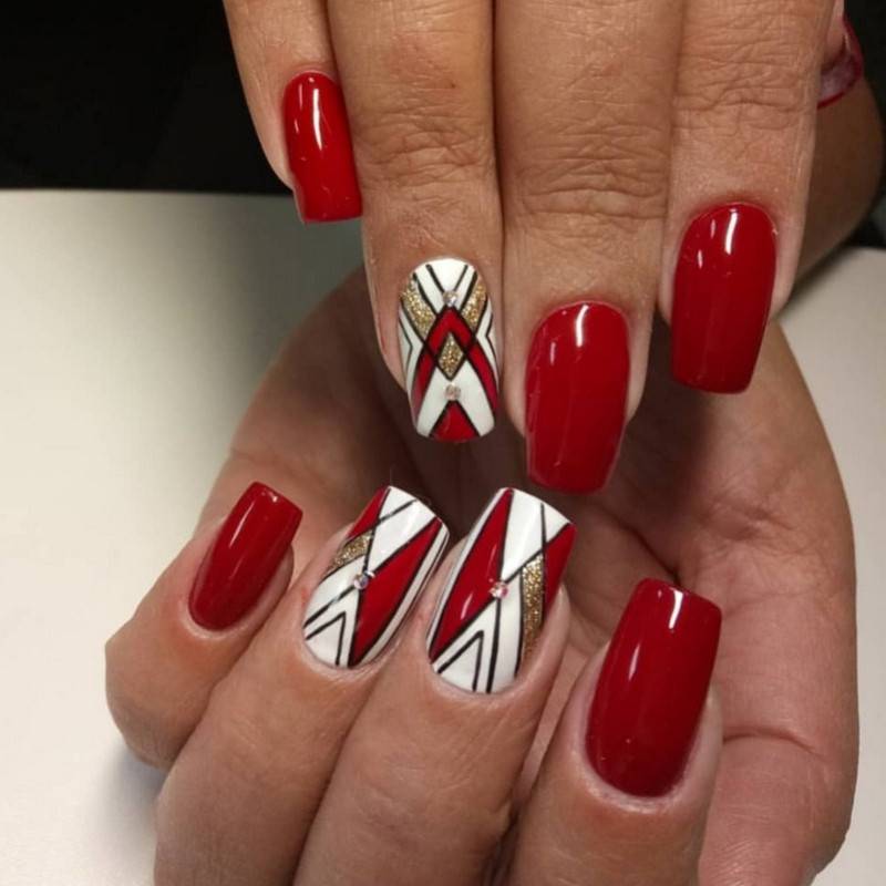 Королевское сочетание красного цвета на ногтях с золотыми декоративными элементами или покрытием смотрится роскошно. Блестящим акцентом может быть орнамент или всевозможные узоры на алом фоне.