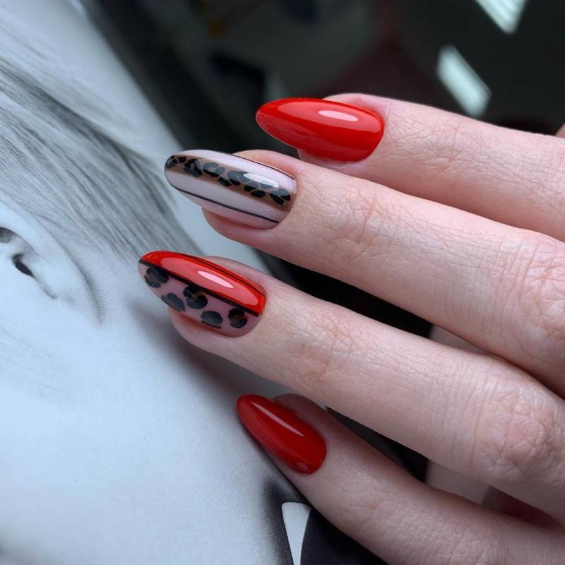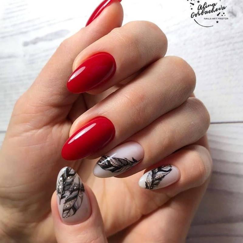 Вторым по-популярности, в этом сезоне является красный маникюр с различными рисунками. Это самое востребованное и желанное сочетание — вне моды и времени. Как мы знаем, красные ноготки любит большая часть прекрасной половины человечества, и рисунки на ноготках предпочитает не меньшее их количество.
