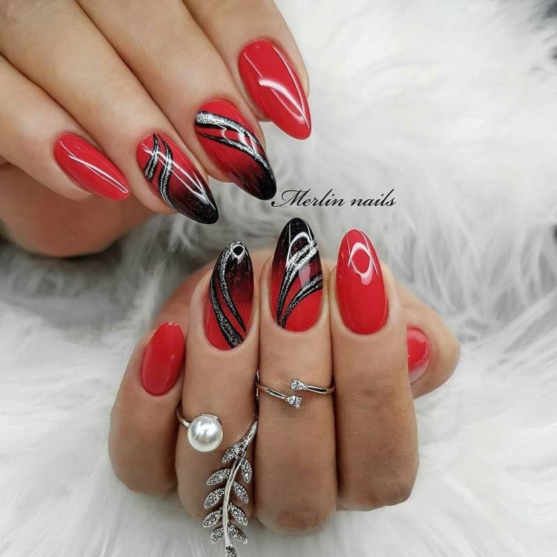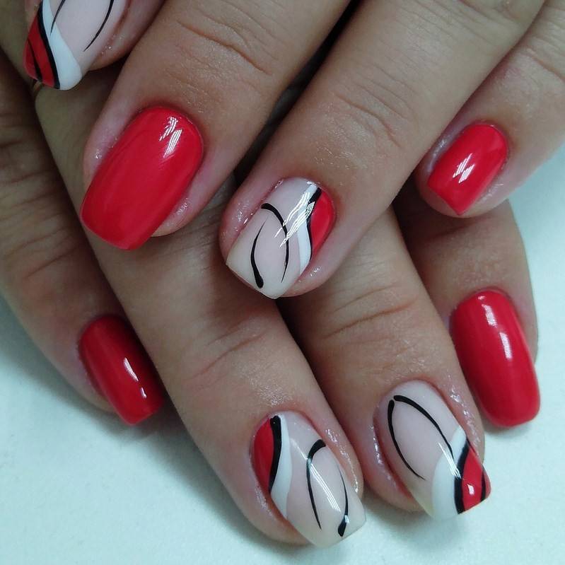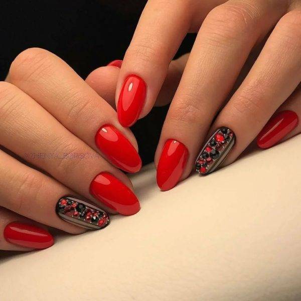 Красные ноготки в сочетании с чёрным. Комбинация этих двух тонов считается неизменной классикой. Чёрный будет служить акцентным цветом, поэтому им лучше делать рисунки, полоски, абстрактные линии на красном. В оформлении допустимы стразы, блёстки.