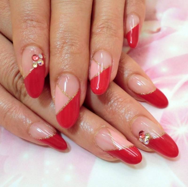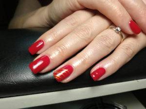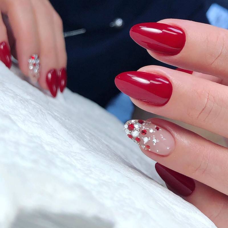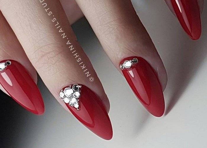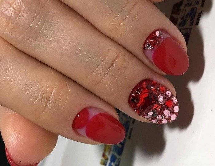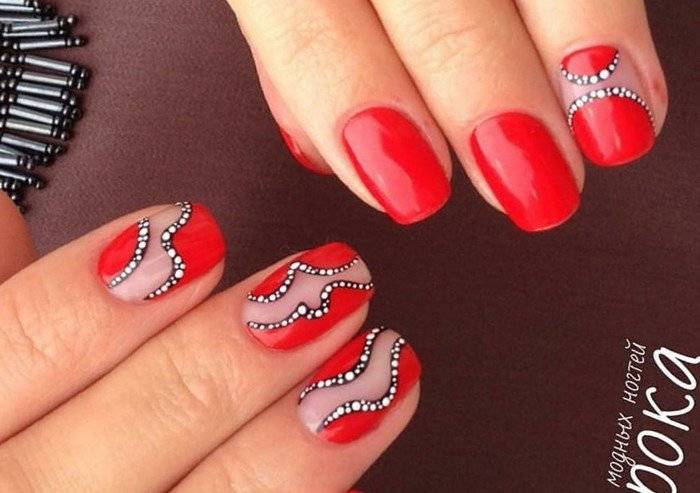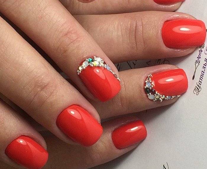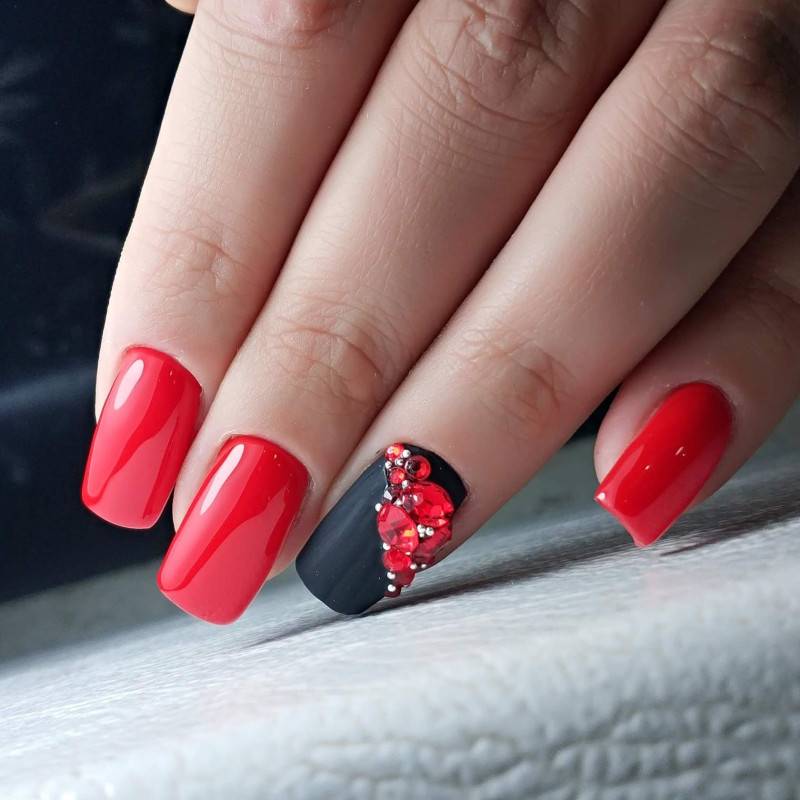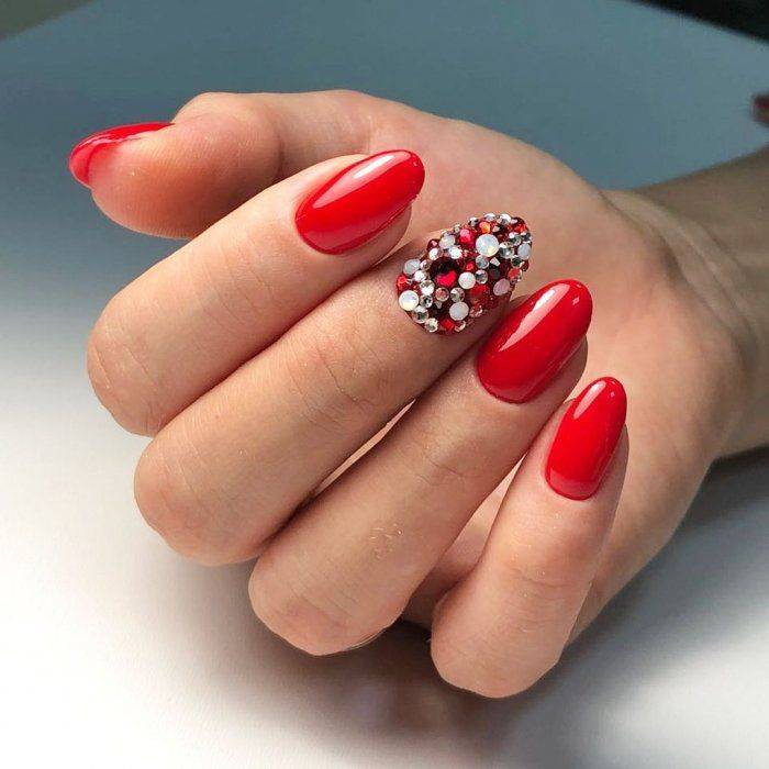 Если вы желаете сделать ваш маникюр более роскошным, то используйте с красным лаком стразы. Маленькие камешки на алых ноготках выглядят очаровательно. Кстати, благодаря прочности гель-лака, стразы не отпадут.