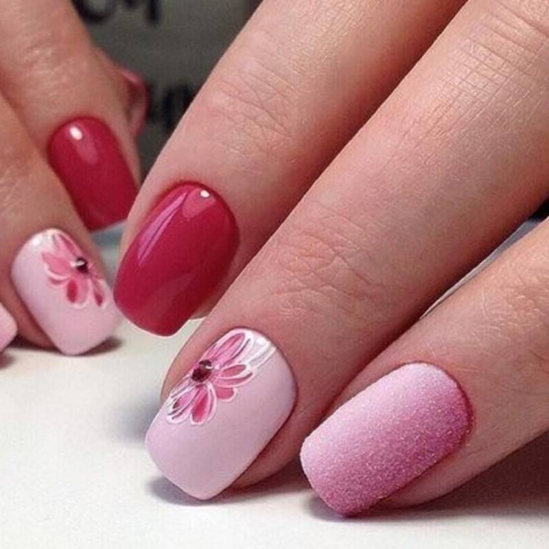 Красно-розовый маникюр. Для этой комбинации идеальна техника омбре или градиента. Переход от красных оттенков к нежным розовым даёт потрясающий зрительный эффект, настраивает на романтический лад. Темные тона лучше располагать ближе к основанию ноготка, светлые – на кончиках.