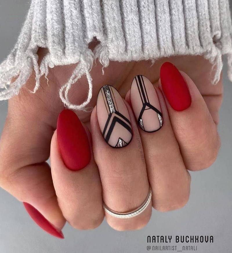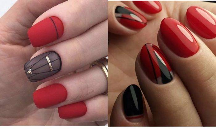 Геометрия в черно-красном альянсе. Маникюр алого цвета с глянцевыми геометрическими полосами смотрится очень достойно и стильно. Можно расположить их хаотично, выстроить в одну сторону или же сделать красивый рисунок с помощью прямых линий – как душа того пожелает. Отличным помощником в создании геометрических узоров станет также модный в этом сезоне гель-паутинка, он сделает линии идеально ровными и четкими.