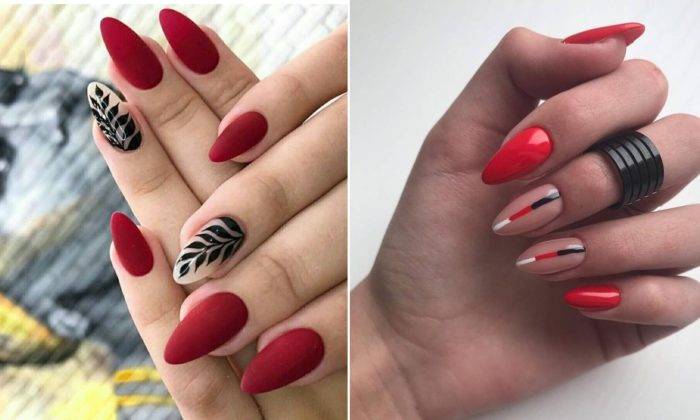Маникюр с красным цветом необязательно должен быть монохромным. Идеи применения яркого лака разнообразны: