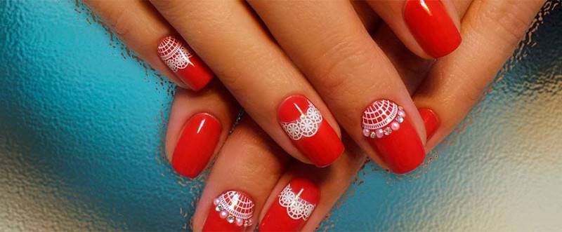 Шеллак красный с белым. Такое сочетание является наиболее востребованным и привлекательным. Белым цветом можно выполнить кружевной узор на яркой основе, сделать френч, нарисовать цветок или другое изображение.