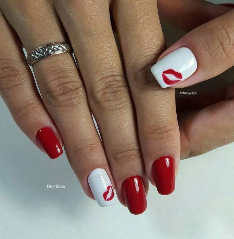 Белым гель-лаком можно изобразить абсолютно любой узор, акцентировать внимание на отдельных ноготках. Самый простой и при этом стильный вариант – поочередное окрашивание ногтей красным и белым цветом