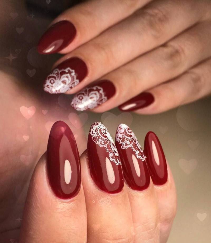 Вуаль или кружево черного цвета на одном или нескольких ногтях эффектно украсит ваш маникюр. Для ее создания необходимо тонкой кистью прорисовывать ногтевую пластину с каждого края. И дальше фантазировать, придумывая узоры в виде ажурного рисунка. Остальные ногти можно покрыть обычным глянцем красного цвета. Такое решение сделает пальчики очень изящными.