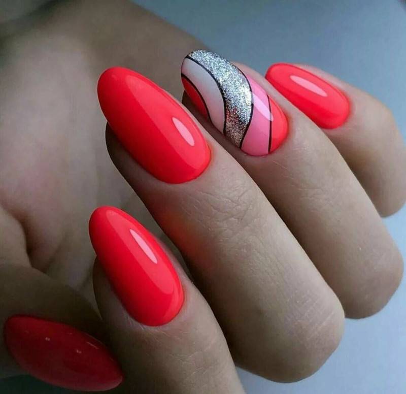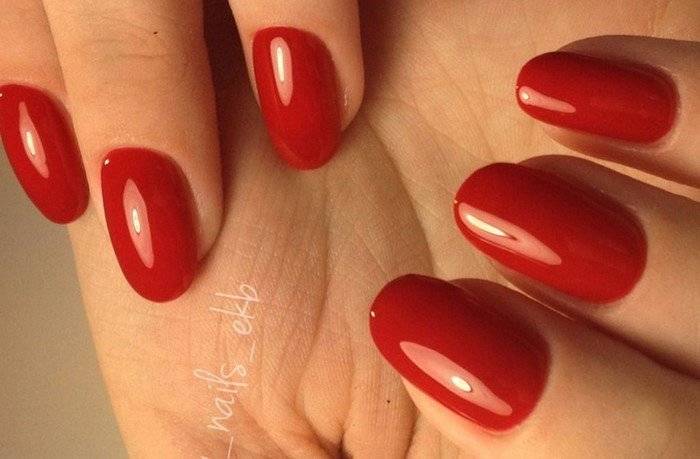 Длинные ногти, покрытые красным лаком, смотрятся особенно эффектно. По цветовой гамме можно выбрать как классические красные оттенки, так и яркие цвета вроде оранжевого, розового, бордового и т.д.